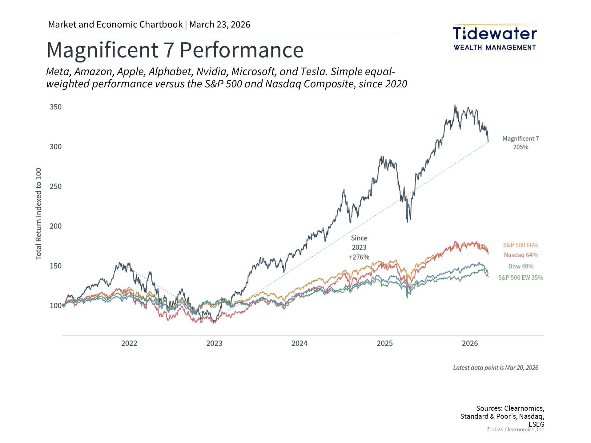Over the past several years, AI-related stocks were among the top market performers, driving strong gains in sectors like Information Technology, Communication Services, and Consumer Discretionary. The success of these sectors — including the group of large technology companies known as the Magnificent 7 — led to a heavy concentration of the overall market in just a few companies.